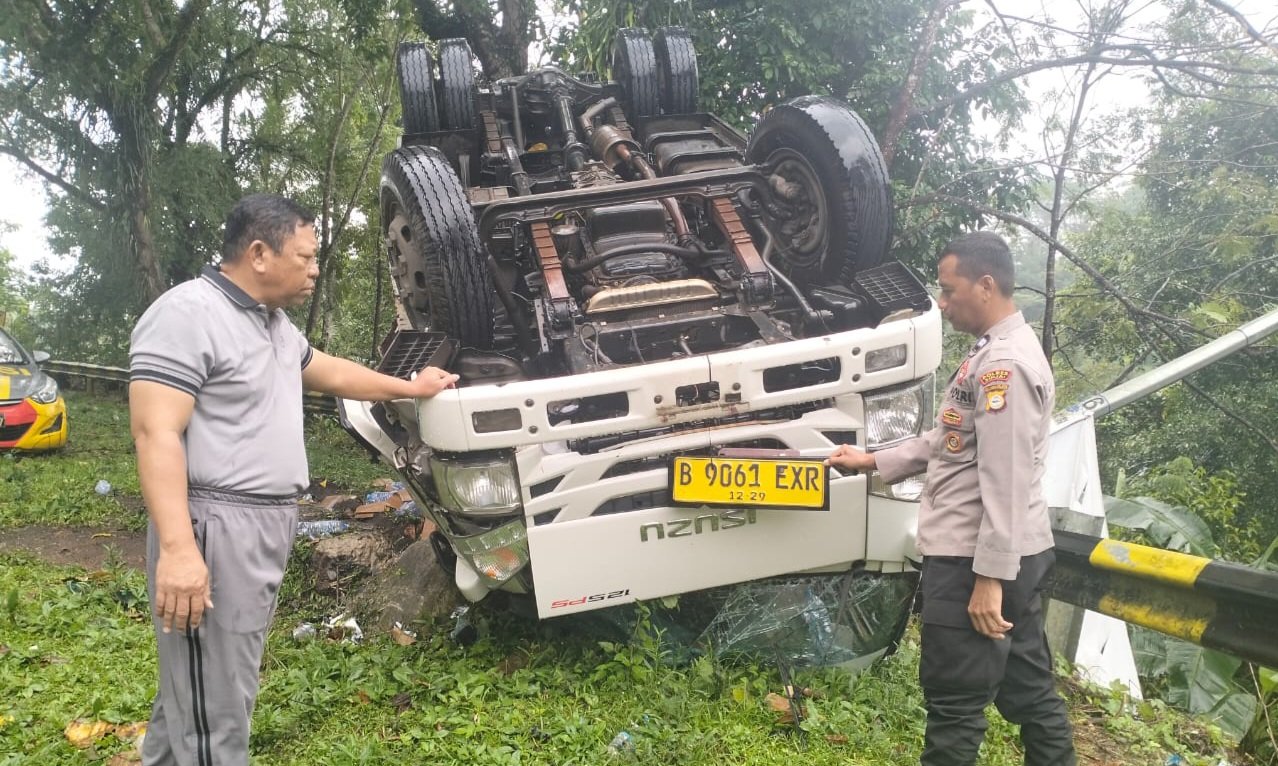 Nampak mobil tersebut dengan keadaan terbalik di bahu jalan.